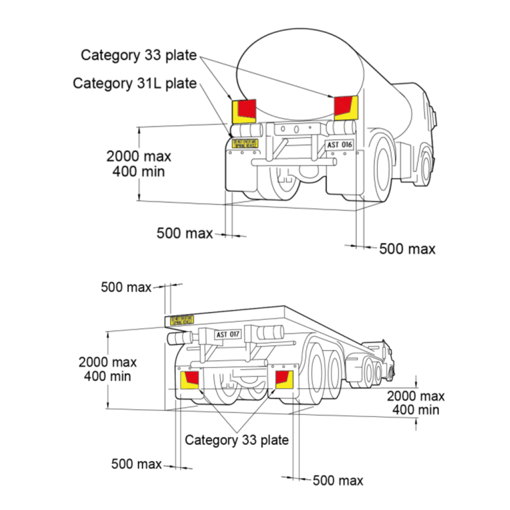 - Position pair of Category 33 plates on the rear surface of vehicle at the same height, symmetrically about the longitudinal centre-line of the vehicle